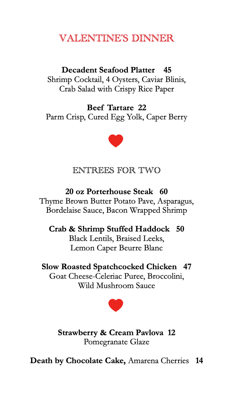 Join us to celebrate your loves.Friday February 13th Dinner from 4 to 9pm.